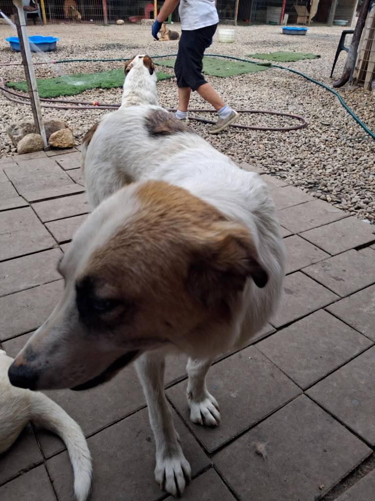 This girl is absolutely adorable and one of our favourites in the shelter. She likes to watch the world go by rather than participate in it. She has a group of friends that she hangs out with. She is friendly to all dogs. She loves people and will come up to you for hugs and a fuss. She goes up to the helpers and nudges them so they pat her on the head. If you sit down, she will come and sit with you. She likes a conversation. If you chat to her she listens intensely. She is 3 years old.