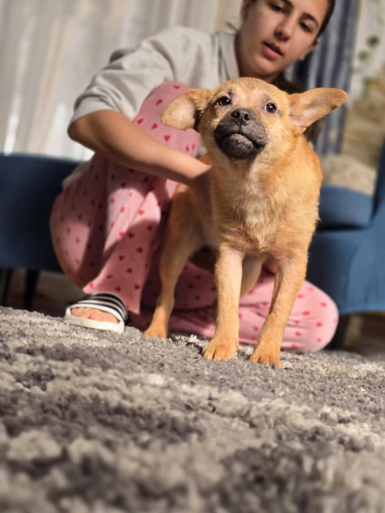 A little girl who was found abandoned on the street by some children. They went to Andreea’s house on Christmas eve with her in their arms whilst Carol singing. They asked Andreea to help her. Moxie was only 2 months old. She is now 4.5 months old and is friendly, affectionate and playful. A typical puppy. She has been around dogs and cats too. She will probably be medium size when fully grown.