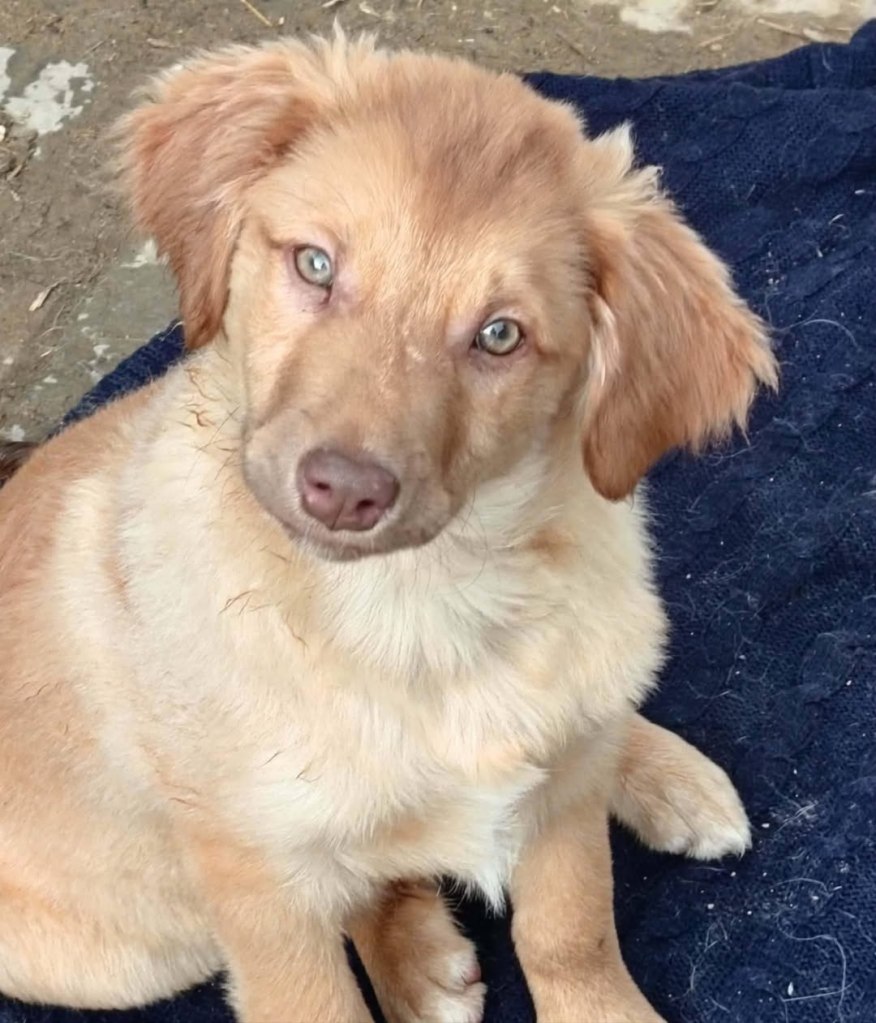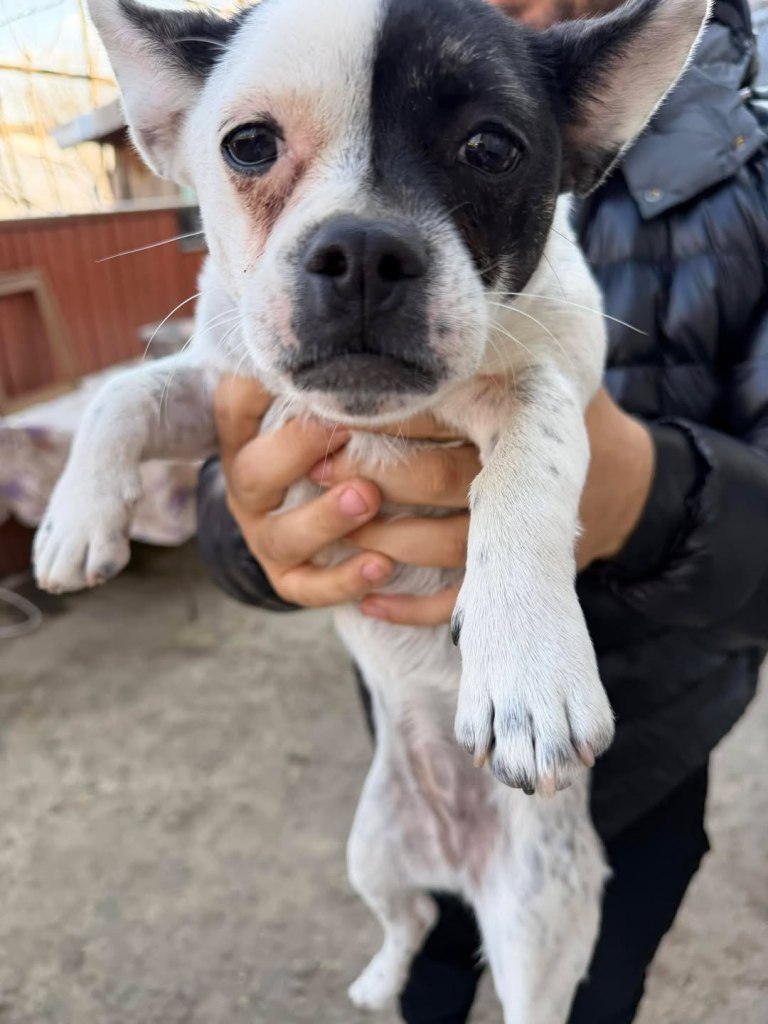 A little boy that we took from Radauti public shelter because he was so small, he would definitely perish from the cold or from the other pups. He is super sweet. Now he is full of mischief and like a proper puppy. Mirela says he has eyes like glass, the most beautiful blue/grey. He is 4 months old at the moment. He will probably be medium size when fully grown.