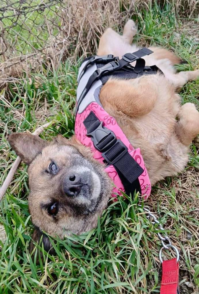 A sad story of where Timmy’s sister sat by their dead mother. Flora was rescued and some time later Timmy appeared in the same spot. It’s in the middle of nowhere so he was lucky to have been seen. He is 5 months old and really friendly. He had a little practice on a lead and was very excited. A sweet little boy. We think he will be a small medium when mature.